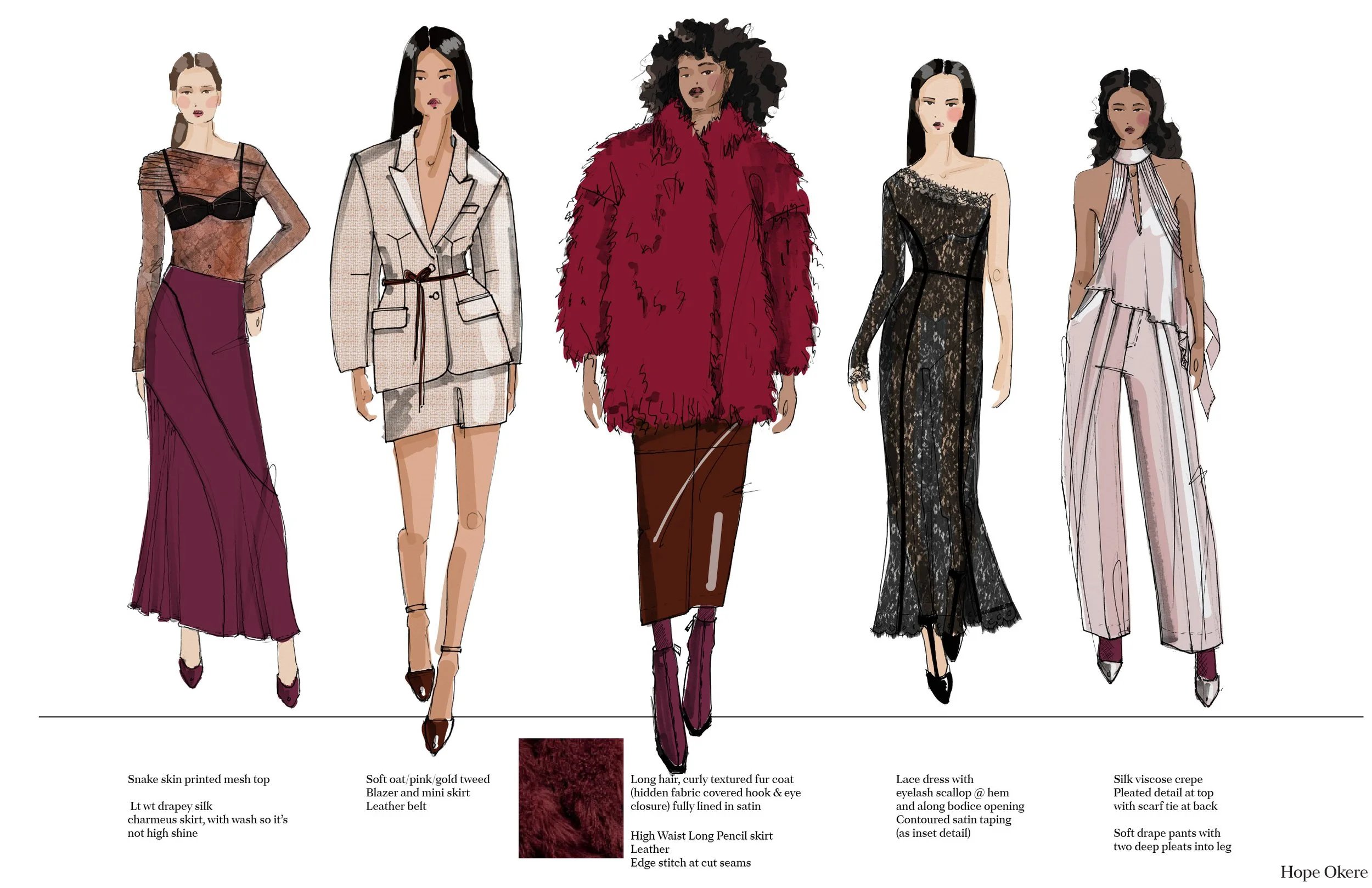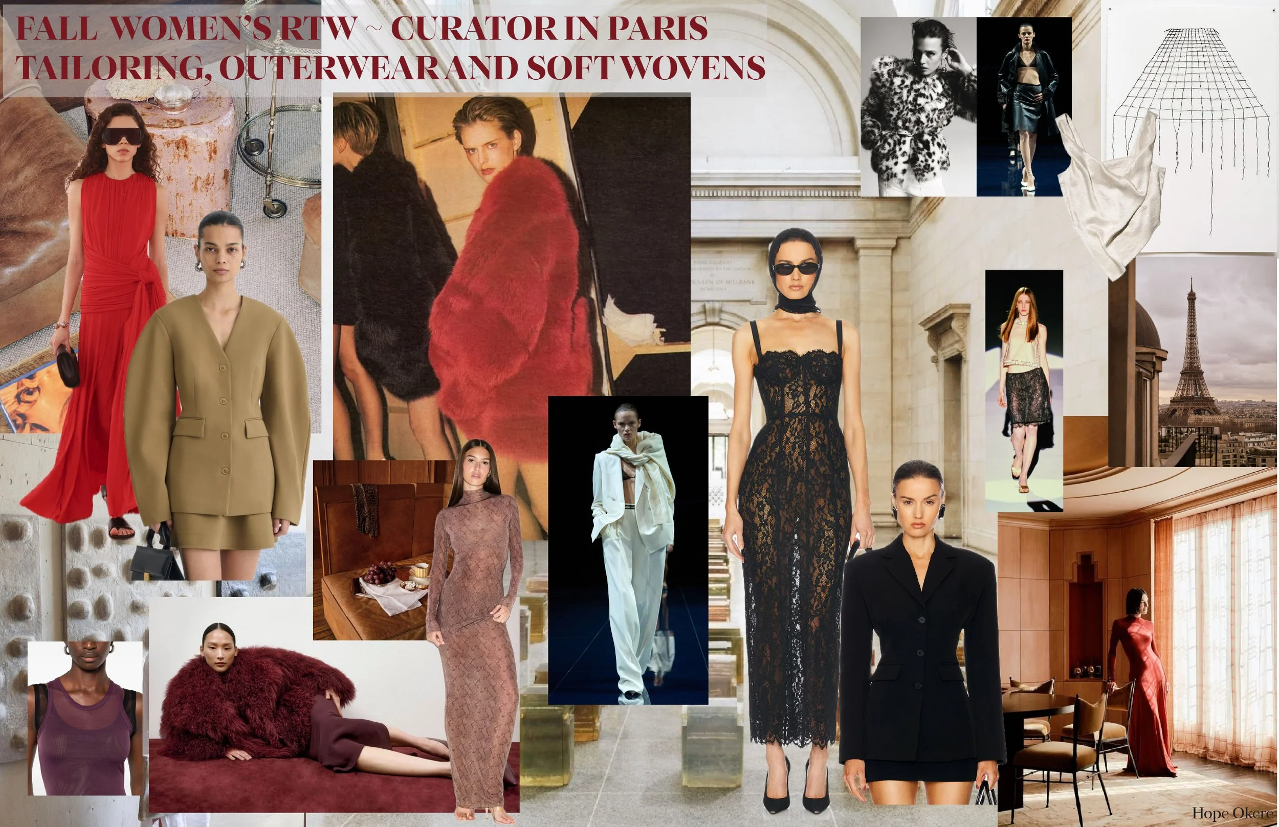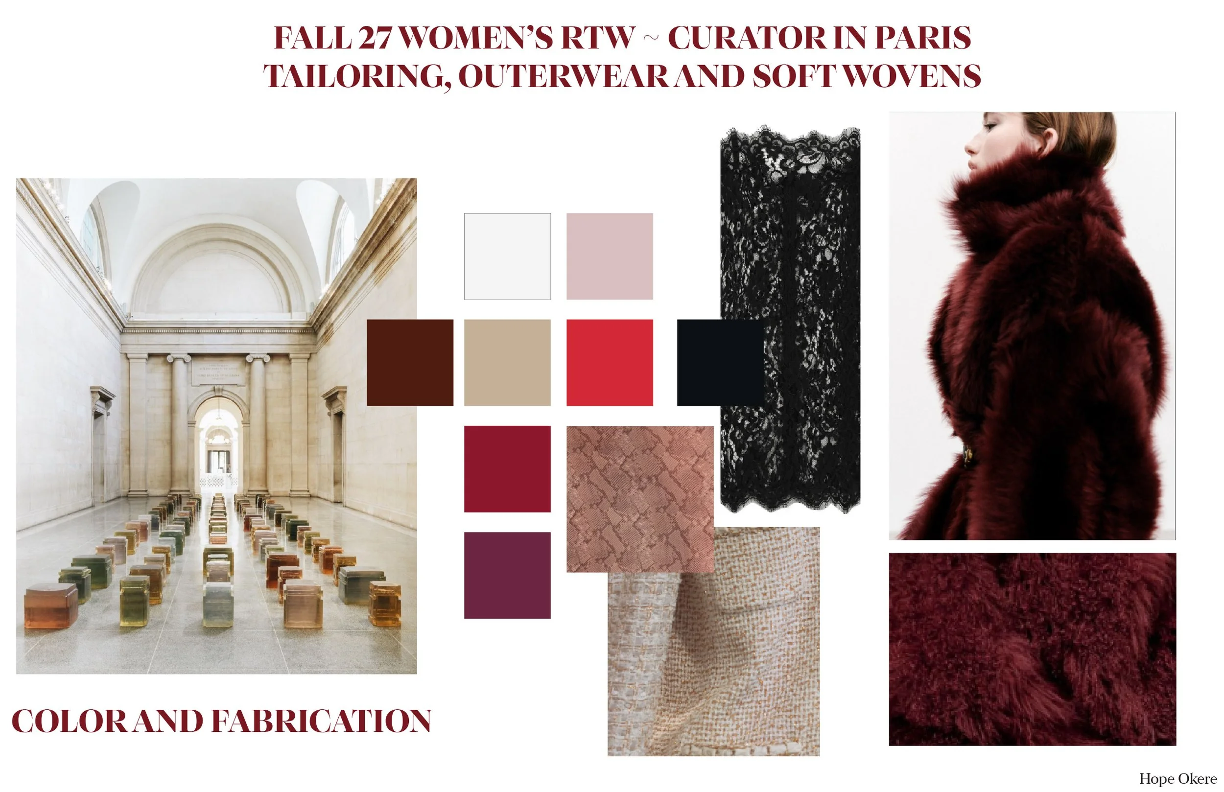 A Fall collection of tailoring, outerwear, and soft wovens, devoted to rich color and texture for a sophisticated woman. Looking to contemporary art for color inspiration and set against the lush architecture of Paris. A focused color palette of moodly wine and plum, bold red, and soft nude rose grounded with chic neutrals of sky white, black and tan.